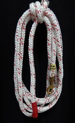 “Lizard Whip” is a whole new feel for a lunge line. It’s made of 3/8 inch rope, the lightest and thinnest rope. It has a lighter brass or silver snap, or a hondo, and a weighted end handle.