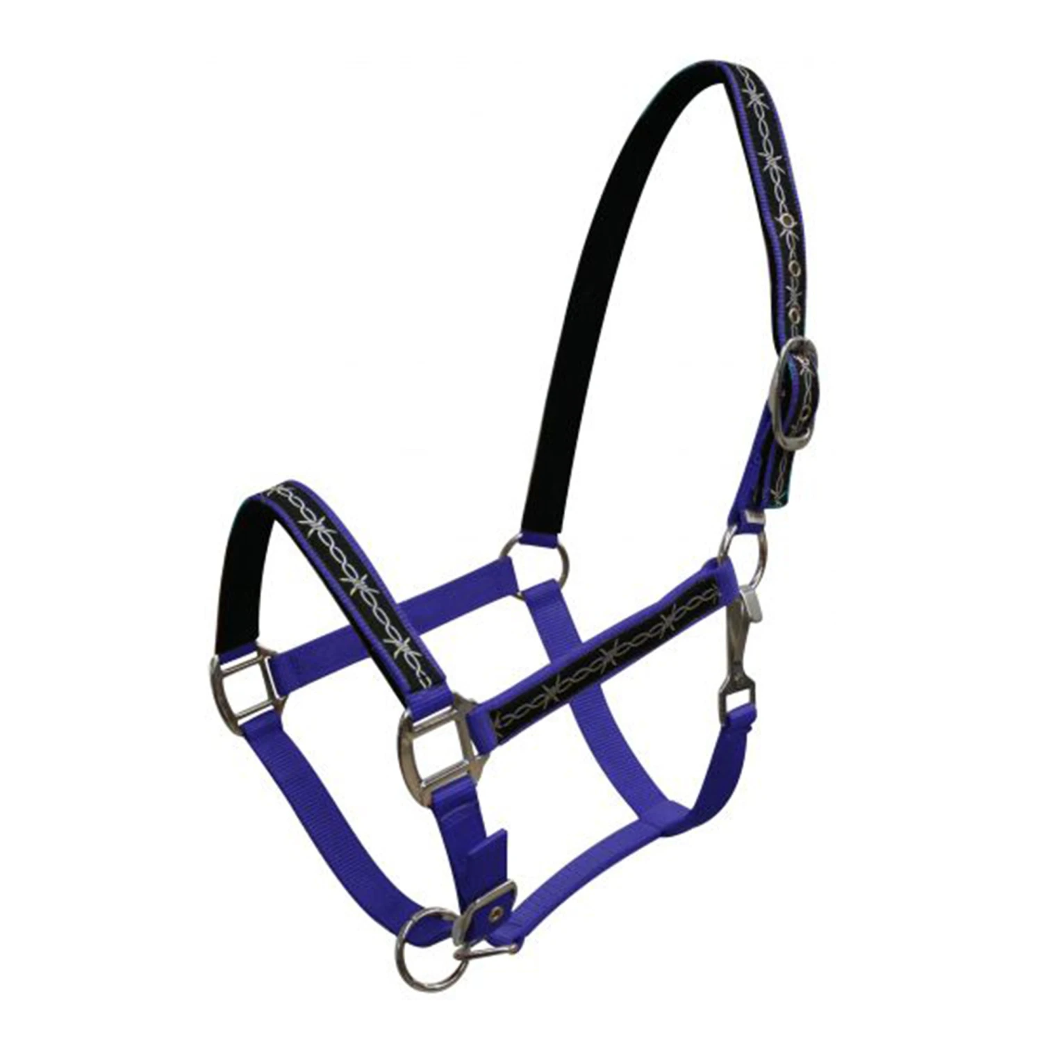 There are multiple colors to choose from in this triple ply Neoprene lined nylon horse size halter with barbwire design overlay. Halter features adjustable nose, nickel plated hardware and eyelets.