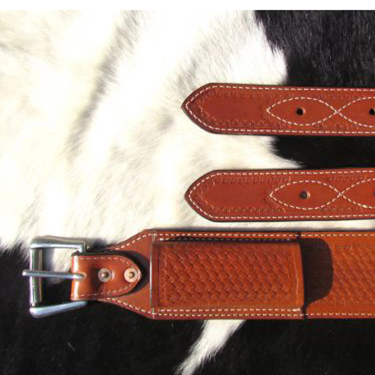 This is a 3″ wide Basketweave Tooled Leather back cinch with roller buckles. This back cinch comes fully equipped with 3/4″ billet straps and girth connector. Roller buckles make this cinch easy to adjust.Â