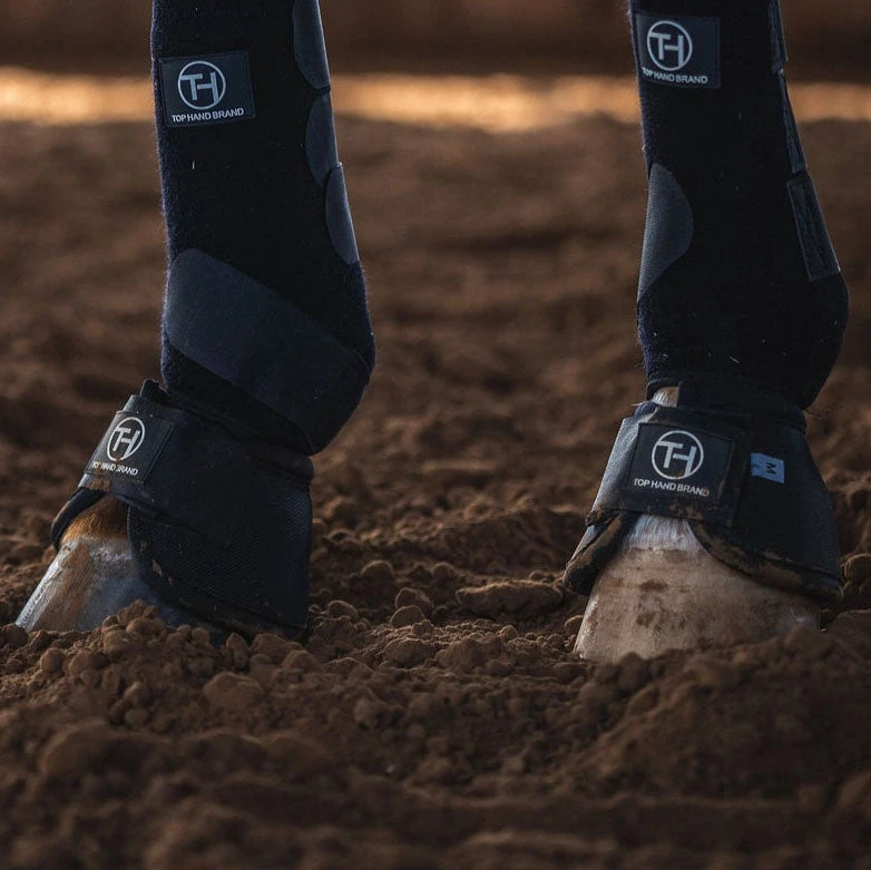 These black bell boots from Top Hand are designed to be fuller sized than traditional bells, with full coverage in the back. They feature Top Hands signature super strength Velcro with no turn design.