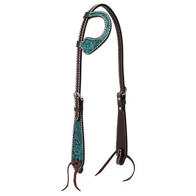 This sliding one ear headstall from Weaver Leather is a dark oil! It has a carved floral design highlighted with a turquoise stain!